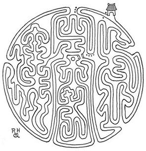 狄公又将迷宫图仔细看了,食指从入口沿宫道移到出口,叹道:“好一个别出心裁的迷宫!若是某人从入口处进宫,每遇三岔路口即靠右而进,他须穿过整个一座迷宫方能到达出口。反之,他若从出口而入,每遇三岔路口即靠左而行,欲达人口处,亦须穿越整座迷宫。然他若不知捷径,则永远也找不到宫中这座亭阁。”